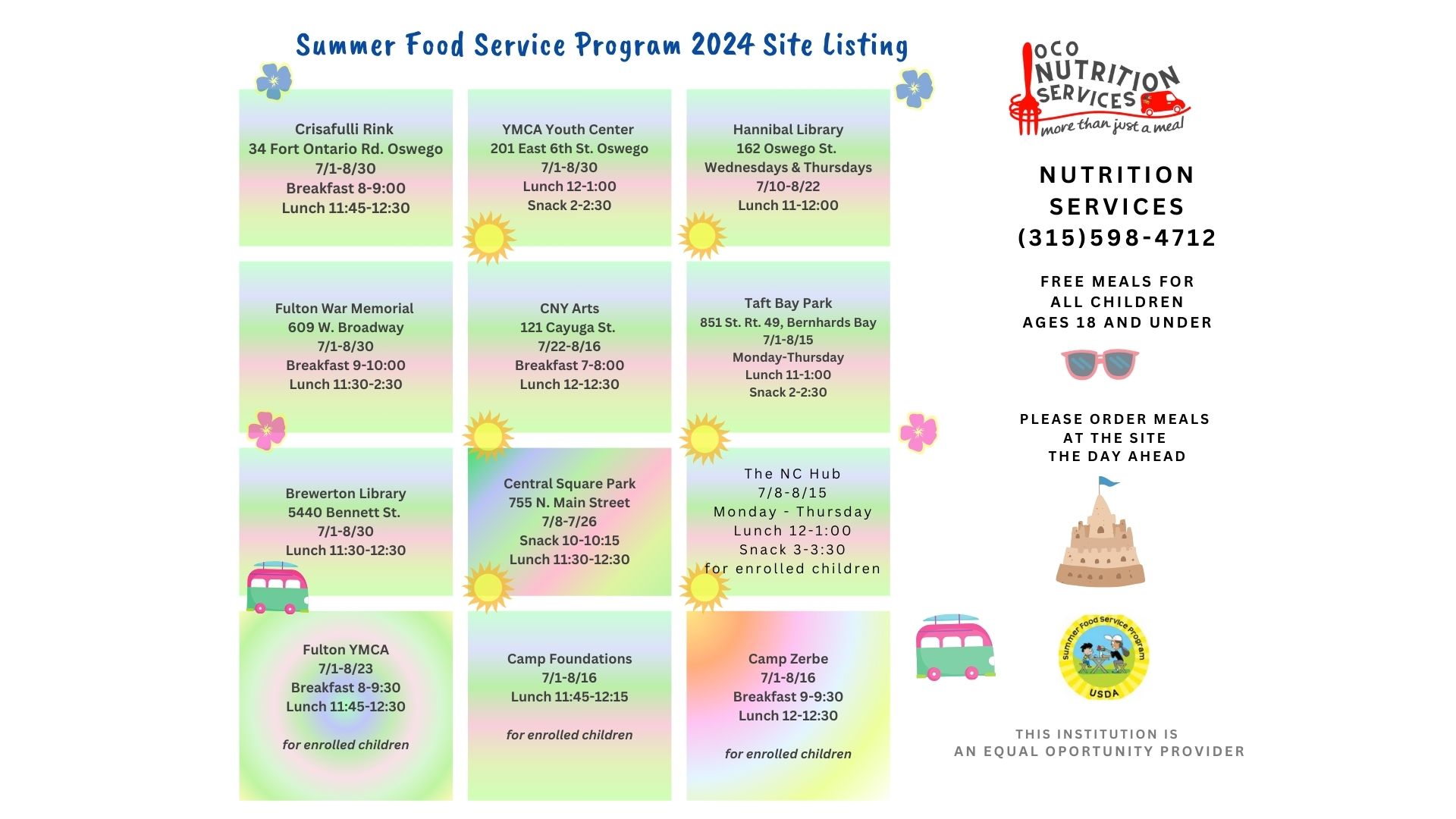 (see attached listing of locations, days and times for meals in Bernhards Bay, Brewerton, Central Square, Fulton, Hannibal, Oswego and Williamstown)